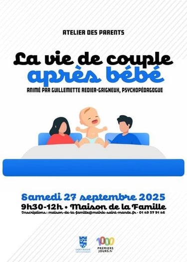 Cet atelier va aborder : les sources de la crise post natale, les idées reçues sur le couple, le couple comme centre de gravité de la famille, l’art de la communication dans le couple et des discussions et exercices pratiques.
