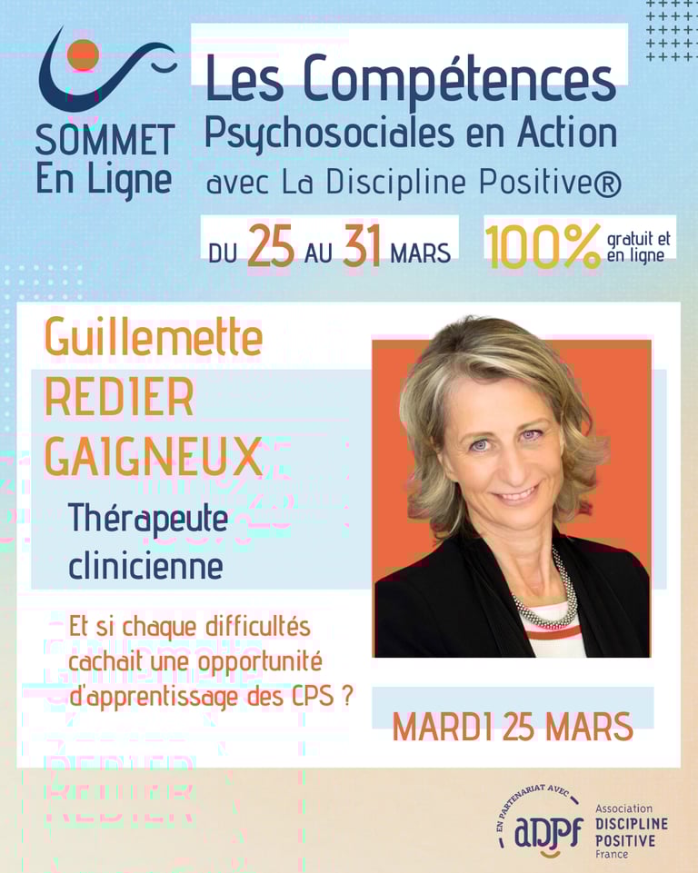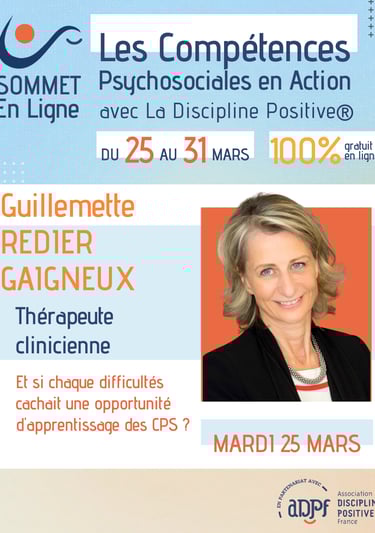 Animatrice : Guillemette Redier-Gaigneux : formatrice Discipline Positive : thérapeute clinicienne - Psychanalyste adlérienne cooptée par l’IAAP (institut Alfred Adler de Paris )